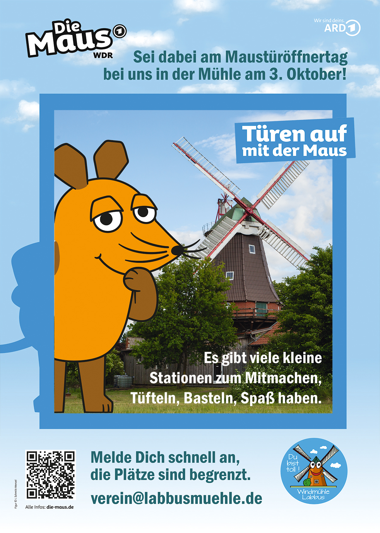 Wir vom Mühlenverein laden dich herzlich in die Windmühle in Sulingen ein! Komm vorbei und erlebe, wie die Zahnräder zusammenspielen und sieh dir an, wie eine echte Windmühle aus dem Jahr 1851 funktioniert. Aber das ist noch nicht alles! Dich erwarten spannende Spiele, knifflige Rätsel und jede Menge Spaß an unseren Mitmach-Stationen bei Türen auf für die Maus.